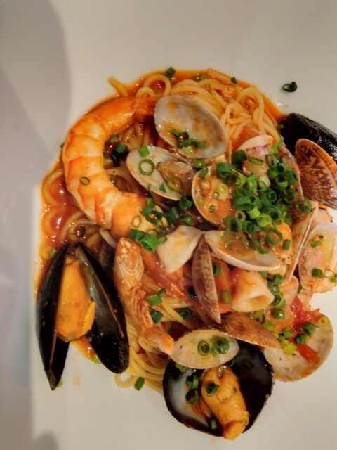 魚介のトマトソースパスタは、とんでもなく食欲を掻き立てる芳香を撒き散らしています。