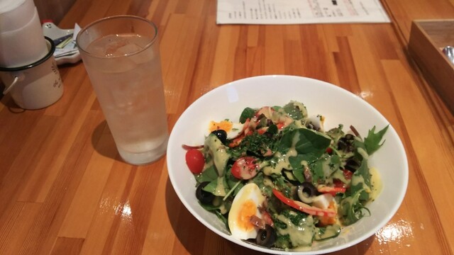 レモンサワーを飲みながら待っていると、イカペペには、生野菜がのってます。(^-^)/