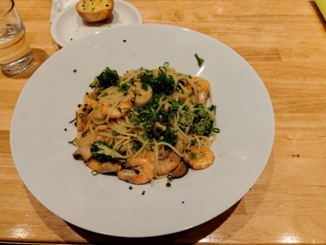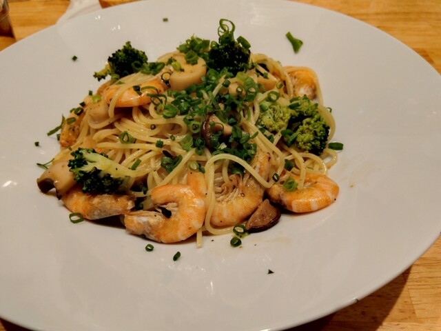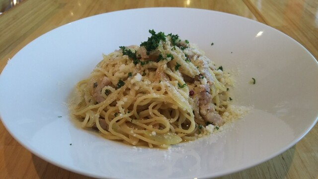 イカを入れてもらったペペロンチーノには、緑が鮮やかなスナップエンドウも入っていて、イカの旨味が出たペペロンチーノに見事にマッチ。