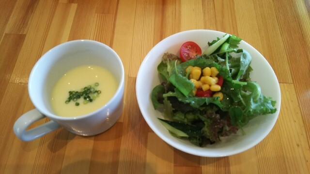 ◆サービスランチ 小松菜とベーコンのペペロンチーノ サラダ スープ パン付き 800円