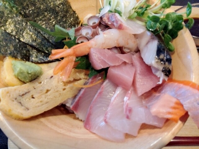 直に私の海鮮丼も出来上り食べ始めましたが、お刺身が多くてご飯に行き着かない。(笑)d(^-^)