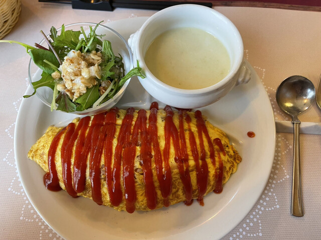 1プレートにオムライス、サラダ、冷製スープ、あとパンがついてきました。パンがあったことに驚き。パンは食べきれないし、持ち帰りできたらいいなと思っていたら、袋をもってきていただけたので助かりました。