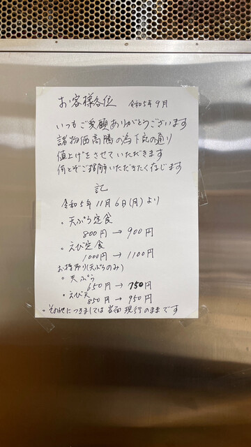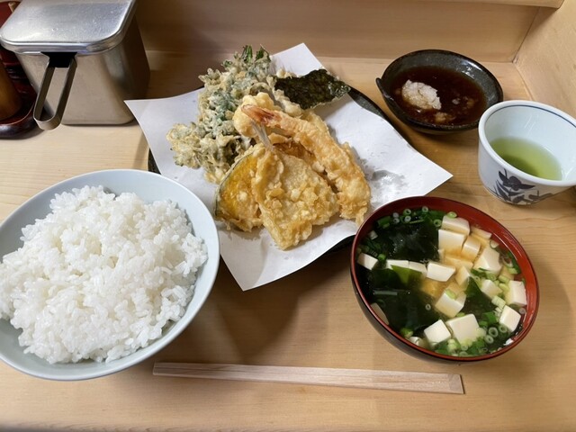 小雨降る夜、店の灯りにつられて入りました。17時半過ぎで外待ちナシ、中で15分ほど待って着席。今日は定食と前から気になっていたカキ(三陸産)を合わせて注文です。熱いお茶をすすりながら待つ。店主の「揚がります」の合図で豆腐味噌汁、ご飯、天つゆが運ばれてきます。店主が脇に寄ってそこをおかみさんがサッと揚げ場を越えて笑顔で手渡す。息ぴったりですね。最後に天ぷらが運ばれて、さぁいただきます!カキは嬉しい2個入り。先ずひとつめのカキを…熱い美味い!しかも大きめでひと口では収まらない。天つゆ無しでひと口、つゆつけてふた口とゆっくり味わいました。定番の天ぷらも存分に楽しみ、最後にふたつめのカキで締めくくり。空の器を見て少し寂しい気持ち。はぁ、ごちそうさまでした。