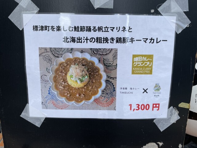 標津町を楽しむ鮭節踊る帆立マリネと北海出汁の粗挽き鶏豚キーマカレー テンション上がる♪