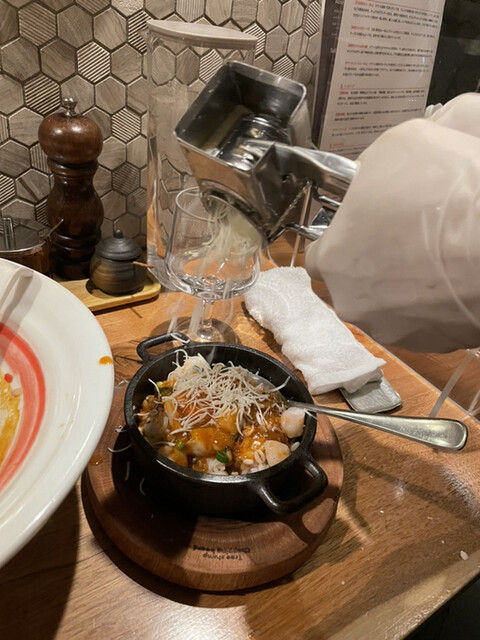 ふつうの白飯が出てくるのかと思ったら熱々の鉄鍋にブツ切りエビと卵が入ったものが来てビックリ!「ここにスープをれんげで4杯かけてください」と言われてかけたらジュワーっと、そしてスタッフさんがチーズをふりかけてくれてちょっとしたパフォーマンスです。熱々リゾットを楽しみつつ残りのスープも一滴も残すまいとすべてたいらげました。