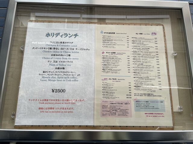 休日に連れと予約なしで初めて訪問しました。開店前の列がどんどん伸びて人気店なのが窺えます。今回はホリディランチを注文。私はサバカレー、連れはチキンカレーにして、チーズクルチャとタンドリーチキンをそれぞれ選んでシェアしました。前菜のサラダから食後のホットドリンクまで全部美味しくて満足!カレーの器が予想より大きくて心配したけど気づいたらきれいに完食でした。