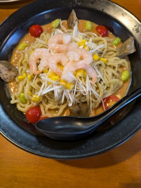 パートナーはいつものぼん蔵味噌、かなり遅れて冷し海老味噌ラーメンが着丼です。