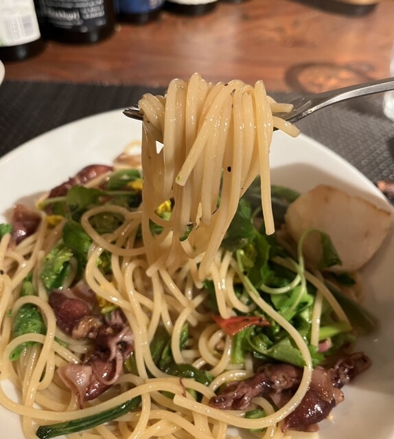 皿の上には、春らしい鮮やかな菜の花の緑とホタルイカの深い赤紫が映える美しい一皿である。ホタルイカのブリっとしたフォルムが可愛らしい。ベースは、アーリオオーリオでそこに、ホタルイカ、グリルされた菜の花、三つ葉、オクラも入っている。そして、カブともう1種類は何かわからない野菜が入っている。ここでも野菜がたっぷり摂れるのは、ありがたい。グリルされた菜の花は香ばしく、私の知らない食べ方である。パスタはもちろんアルデンテ。ホタルイカ特有のほんのりした苦みと磯の風味が絶妙で、オイル系のソースとよく絡み、噛むたびに旨みが広がる。菜の花も程よいほろ苦さとシャキシャキした食感が、ホタルイカの濃厚さを引き締める。春らしい爽やかさがあり、全体のバランスを軽やかにしてくれる。