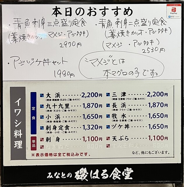・イワシの定食(刺身、生姜煮、天ぷら、塩焼き、南蛮漬、フライの組み合わせは選択制)