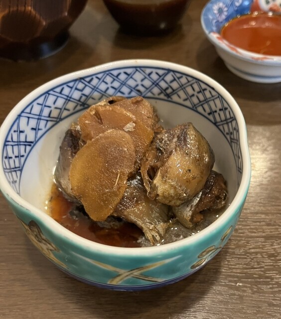 そして、イワシの生姜煮。箸を入れると、骨までやわらかく煮込まれており、身はほろりと崩れるほどの柔らかさ。もちろん骨まで食べれる。イワシの脂の旨みとともに、しっかり染み込んだ甘辛い煮汁に、生姜の風味が効いていて、後味をさっぱりと引き締めてくれるのも心地よい。濃すぎず薄すぎず、絶妙な味加減で、白ごはんやお酒との相性は抜群。魚を知り尽くした店ならではの、素材を生かした煮物である。素朴ながらも、しみじみ「うまい」と感じる一皿である。