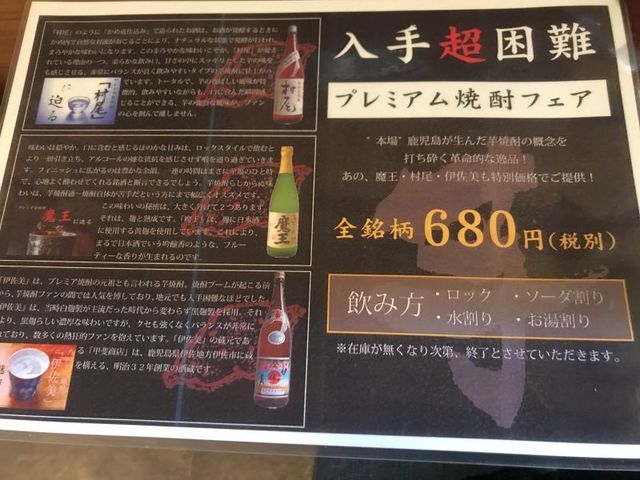 魔王に村尾に伊佐美…滅多に手に入らない焼酎好きにはたまらないお店でしたね。