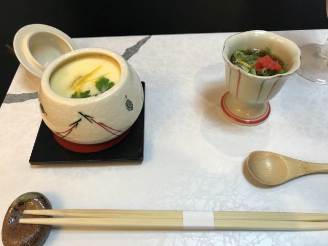 1品目、「蟹と海老入り茶碗蒸し」、「なまこの酢の物」。茶碗蒸しに蟹が入ると旨味がすごくなりますね~。