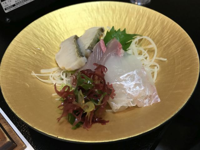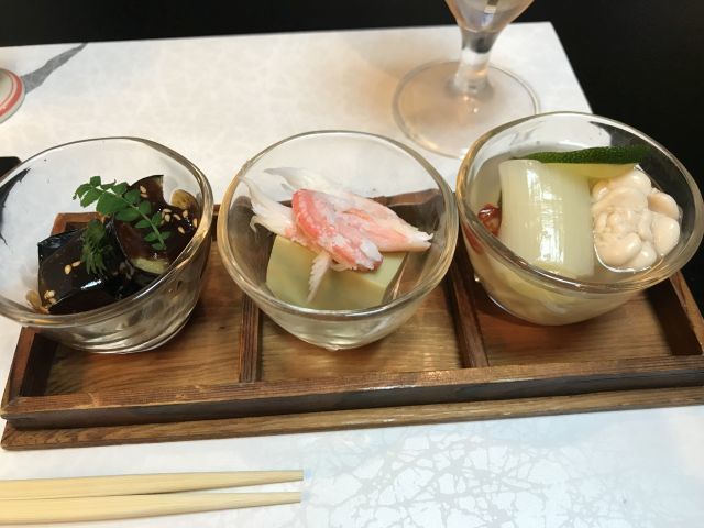 2品目、先付三種盛「茄子の揚げびたし味噌乗せ」「蟹身と蟹味噌豆腐」「太ネギとタラの白子巣立ち添え」蟹味噌風味の豆腐が珍しいですね~。珍味でした。