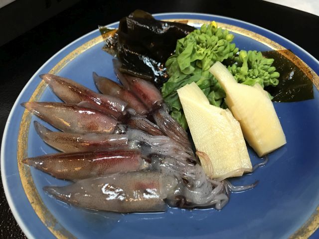 3品目、「ホタルイカ、菜の花、筍、わかめのしゃぶしゃぶ風」ホタルイカがこれほど美味しいとは思いませんでしたね。付けタレも上品でわずかな生姜の風味が効いてました。