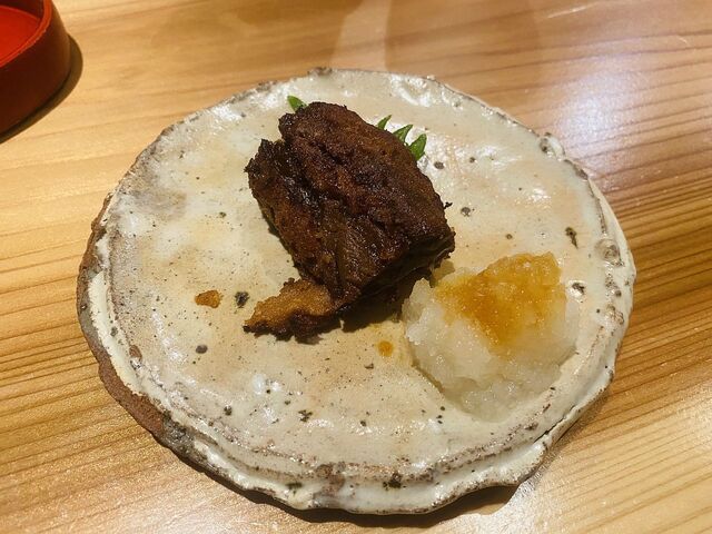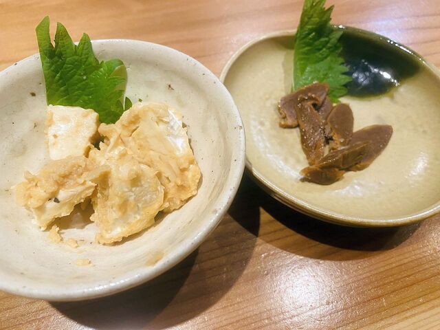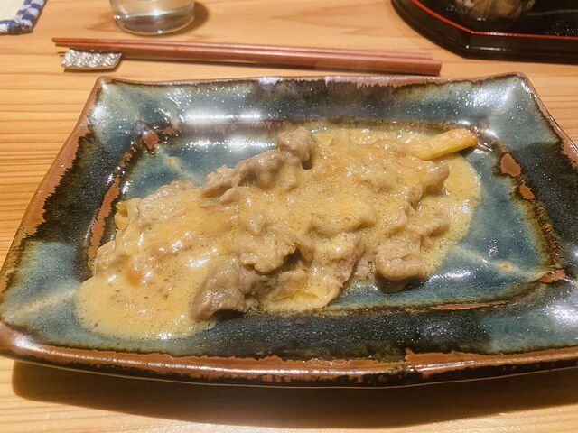 お店では熱燗を推薦されてたので熱燗を頼みました。その後「チーズの味噌漬け」「イカワタのルイベ」を飛露喜で流し込み、牡蠣の土手焼きと牛スジの土手串を黒龍で流し込むという離れ業をやってのけました。