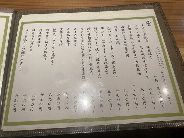 まず突き出しにイカの醤油漬け(胡麻油の香り)に能登地震の復興のために作られた天狗舞の「初桜」にまず感銘を受けました。その後、福井在住の私は福井の名物「へしこ焼き(鯖のぬか漬けの焼いた物)」に福井の酒、九頭竜を。