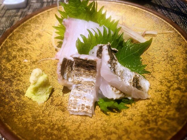 #2 太刀魚のお造り・・・皮面を炙ってあって香ばしい。太刀魚って小骨が多いんですが見事に捌いてありました。