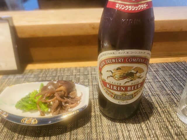 #1 キリン瓶ビール・・・お通しが付いてます。耳イカと菜の花の煮付け、耳イカって初めて食べたわ。