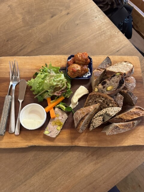 6〜8種のこだわりハード系パンに、サラダと自家製のお惣菜4種が付いた贅沢なセット。パンはどれも風味豊かで、特に胡麻やオリーブ入りのパンは香り高く印象的。しっとりとしたレバーパテやスパイシーなミートボール、まろやかなクリームチーズなど、それぞれの小皿料理がパンの美味しさを引き立ててくれます。まさに“パンを主役に楽しむ”一皿。