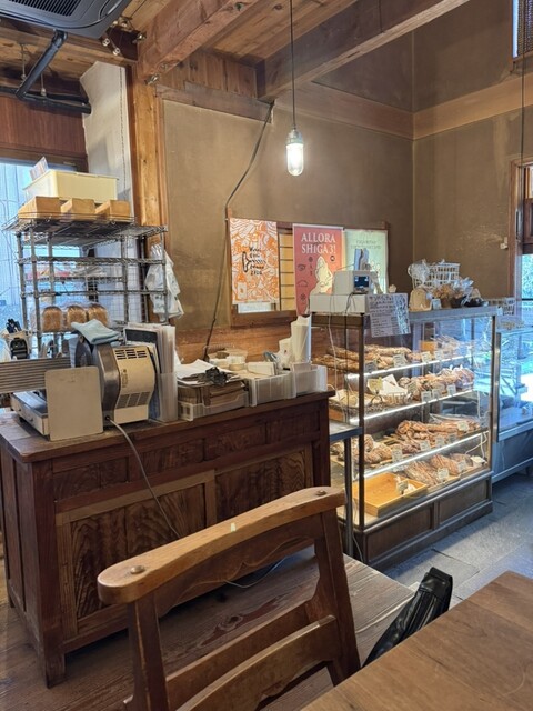 木の温もりに包まれたナチュラルな店内は、まるでヨーロッパの田舎町にあるパン屋のよう。座席間も適度なゆとりがあり、静かに過ごせる心地よい空間です。テイクアウトのパンコーナーも充実しており、思わず持ち帰りたくなる魅力的なラインナップ。