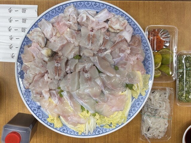 てっちりセットをテイクアウト予約しました。以前カウンターのガラスのネタケースに下処理された大きな河豚がでろんと佇んでいて気になってました。握りで注文した事はありますが鍋で食べたかったので自宅でてっちりパーティーにしました。ちゃんとした陶器の大きなお皿に盛り付けて頂き、味は河豚皮も身も旨味たっぷりの美味しい河豚でした。