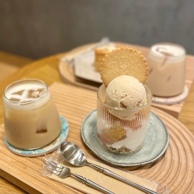 ・日本茶ミルクティー(アイス) 茶葉:国産烏龍茶 プラントミルク:ソイミルク 甘さ:ストレート ・藤の花パフェ