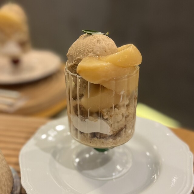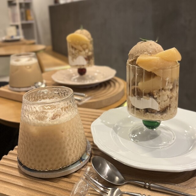 ・日本茶ミルクティー 茶葉:有機玄米茶 プラントミルク:オーツサイド 甘さ:ストレート ・ベリーとピスタチオアイスのスコーンパフェ