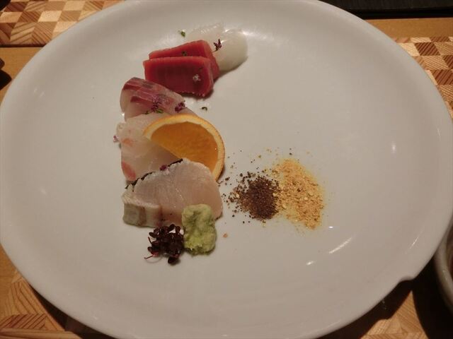職場のイベント企画で格安で食事ができるので、夕食に利用しました。ワンドリンク無料(1100円までのもの)です。はじめに菜の花豆腐と蒸し牡蠣とホタルイカと野菜のお浸しのようなものがきました。その後は小鯛やサーモンの料理。蟹の汁物、お造りが旨い来ます。お造りの鯛や本マグロ、鰆がとても美味しかったです。その後に来たのが焼き物と桜餅???らしいもの。ダシが効いていてそれが素材をよく引き立てています。それからアスパラの焼き物や牛肉のお吸い物、山形産の蕎麦が出て、〆はポンカンのアイスでした。全時間2時間40分以上です。味は最高でした。