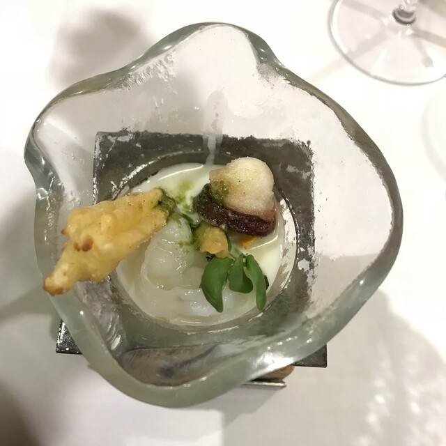 前菜は水ダコとヴィシソワーズ、ニョッキフリットと色んなじゃが芋チップス