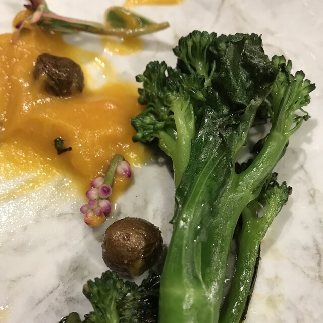 メインはハーブ岩手豚ロースの炭火焼、バターナッツのクレマと季節のお野菜