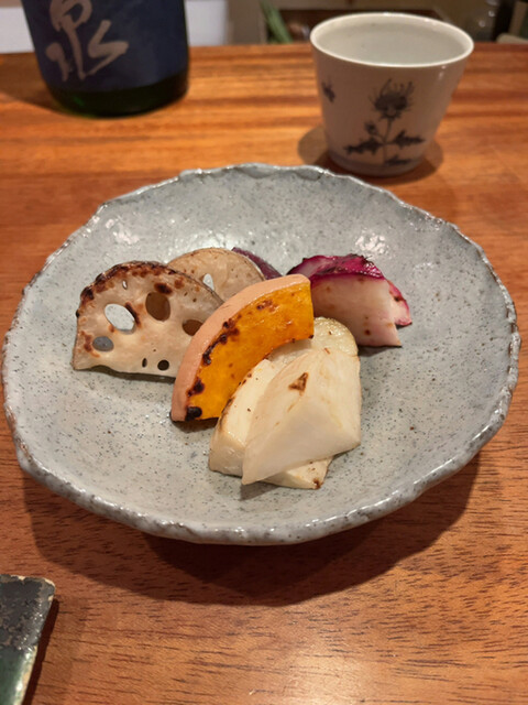 焼き物は、バターナッツ、そうめんカボチャ、カボチャ、さつまいも、とうもろこし、山科茄子。普段見かけないような野菜も色々食べられるのが楽しい。焼き加減も良く、甘み、旨みが引き出されている。