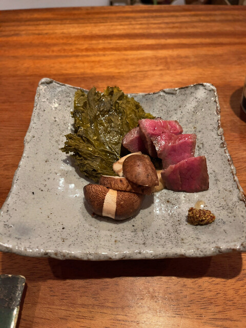 その後、尾崎牛と天草大王のモモの焼き物。塩胡椒と自家製マスタードで食べる。シンプルゆえに素材の旨みを堪能する。