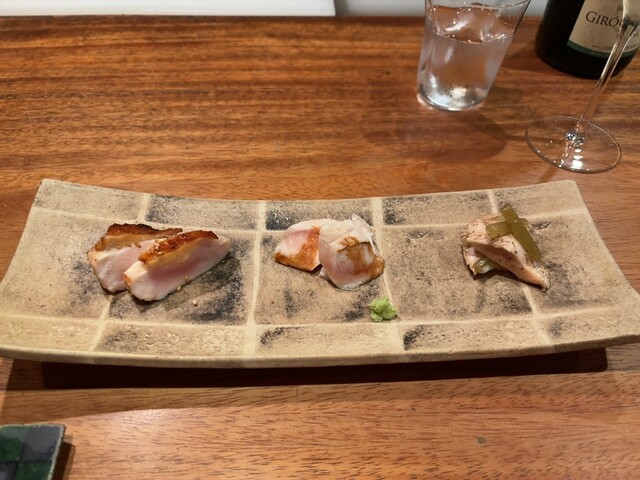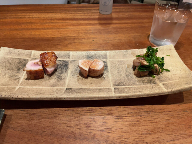 まずいつもの鶏胸肉3種盛りからスタート。漬けと少しレアでねっとりした胸肉のタタキやささみ。ささみには柚子の皮を少し散らしていてニクい。でもこの中で一番好きなのはタタキ。噛み締める度に旨みが広がり、ずっと味わっていたくなる一品。