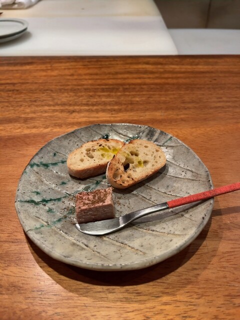次に白レバーのパテと薄く焼いたバゲット。レバーの甘みと香りに胡椒の香りと刺激、そこにカリッとしたバゲットの食感が良い感じ。