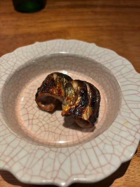 秋刀魚の身をクルッと巻いたものを串に刺し、途中肝醤油を付けながら焼いたもの。酢橘、大根おろしに実山椒。肝醤油の苦味が大人の味。