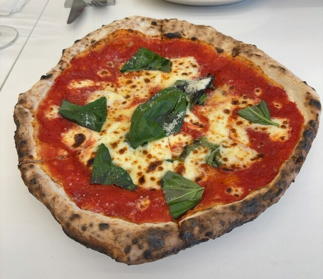 モッツァレラやトマトソースの量がしっかり。オリーブオイルは少なめ。生地は塩味控えめの薄めで、さっくりした焼き上がり。
