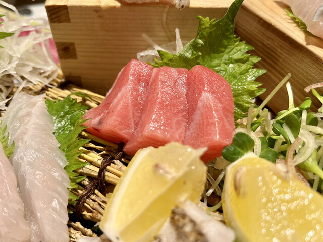 ○刺身盛り合わせ(中トロ、クエ、縞鯵、ノドグロ炙り、太刀魚炙り)
