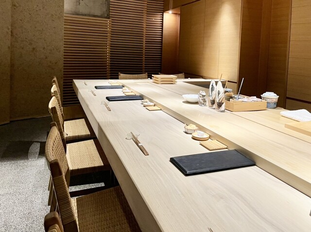 カウンターは榎、檜、銀杏の木を使用した木材一色のシックな店内です‼︎