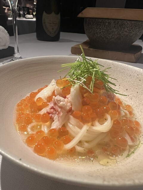 北海道 毛ガニ・イクラと秋田稲庭うどんの冷製パスタふう