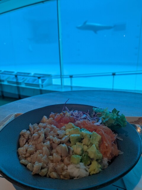 ポキ丼は、正直そこまで期待していませんでしたが、具材がたっぷりのっていて、美味しかったです。水族館に併設されたレストランで、カフェレベルのご飯を食べられるとは。