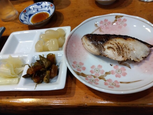 乙女ブリの塩焼きが出て、4つに区切られたお皿に乗せたらっきょうなんかはカウンターの上の大皿から取り放題だとか。脂の有るブリとガリを合わせて頂くと、これまた美味でございました。ここまでが1000円だとか。ビックリです。