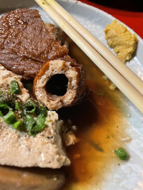 ほろっほろ。何これ初めて食べたおでんのたまご。過去一かも。白身が解けていく。白身がギリギリ固形を保ってるくらい。すごい。黄身までもちろん黒い出汁が染みている。黄身もトロトロ、変なとこだとパサついたキミが出てくるが全く違う