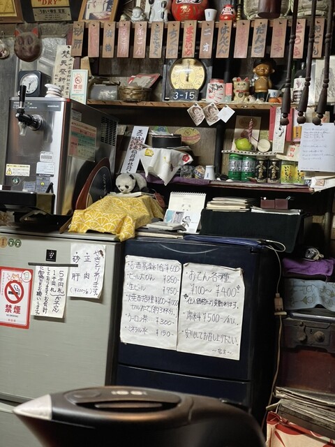 冷蔵庫に紙が貼ってあるが、おでんは100-400円、焼鳥は1本200円らしい。あと席料500円との