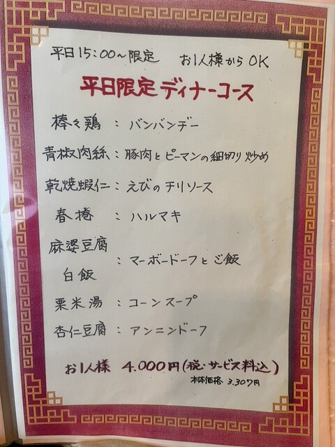 上尾駅前のニトリが入っているビルにあります。平日の夜18:00時頃に行きましたが、お客さんは一組のみ。その後ちらほらと別のお客さんが入ってきましたが、店内が広いのでゆったりとと過ごせます。せっかくの平日だったので、1人からでも頼める平日限定のディナーコース(税込み4000円)をお願いしました。コース内容は、まず前菜のバンバンジーから、豚肉とピーマンの細切り炒め、海老のチリソース、春巻き、麻婆豆腐と白米、コーンスープ、最後に杏仁豆腐という順番で提供されました。料理は上品な味で、麻婆豆腐は白米の上にかけながら食べるのが良いでしょう。どれも1人で食べきれるような少量なので、少しずつ味の違いを楽しみながら過ごせました。お値段も相応の満足感を得ることができました。