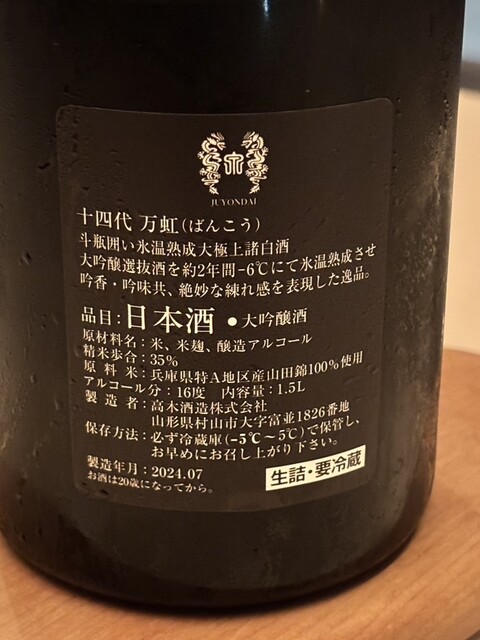 瓶の裏書きによると、大吟醸選抜酒を約2年間マイナス6℃にて氷温熟成させたとのこと。