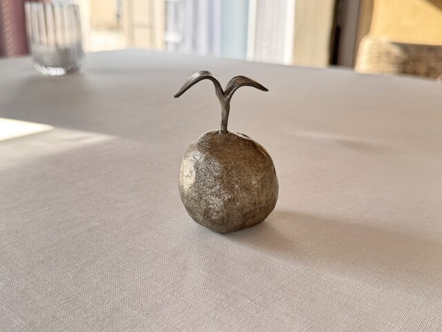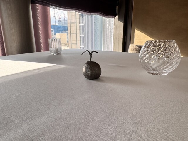 個室で優雅なランチ。テーブルの上にはシェフの息子さんが描いたリンゴの置物。心温まるリンゴ♪
