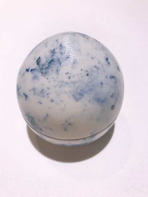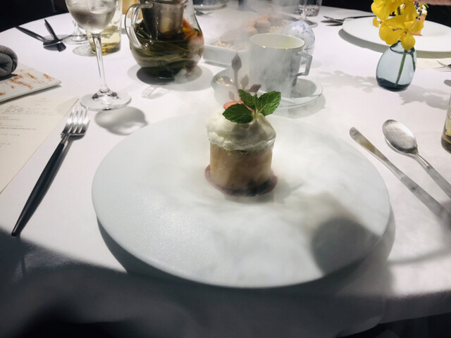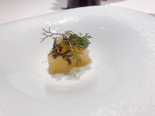 お口直しに、ラフランスを65度で熱して甘味をだしてから冷やしたデザート。ラフランスの水蒸気を凍らせてかき氷状にして上にかけてくれています。器の中がラフランスの爽やかな香りで満たされていました!