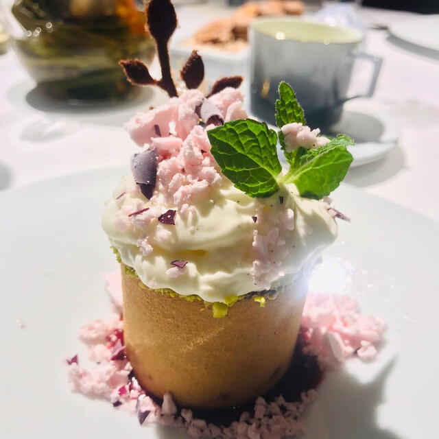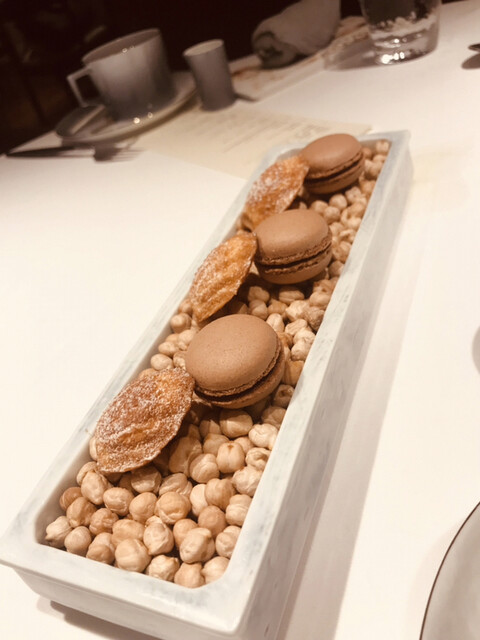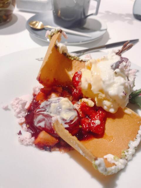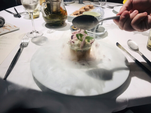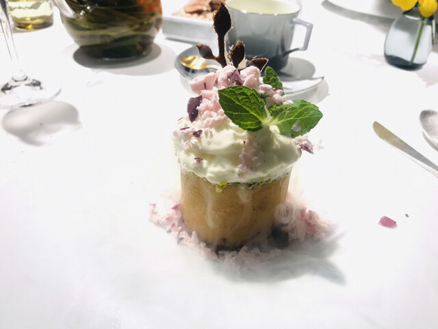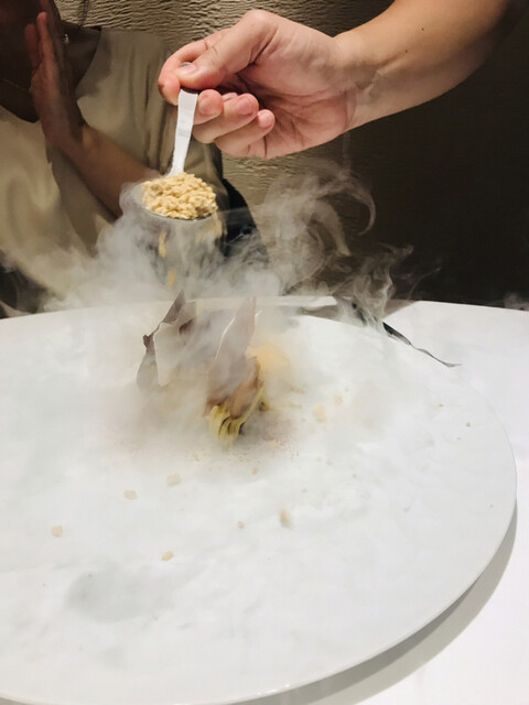 中に濃厚なマロンが詰まり、そとにはチョコやメレンゲが乗せられており、そこにアイスも付いている。その上から液体窒素で、サクサクしたものをかけてくれる楽しい演習。最後まで美味しさに囲まれて幸せでした。