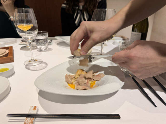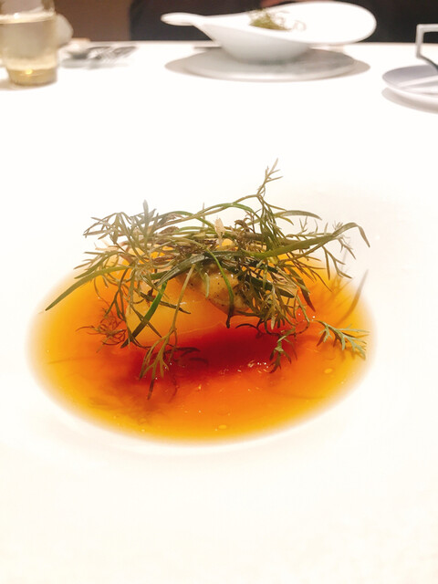 お魚は、グリーンのソースの上には綺麗にアレンジされた金目鯛に、さらにオレンジのソースがかけられて、色も変わりつつ、フカヒレなども入っていて、それらが融合して、とっても美味でした。