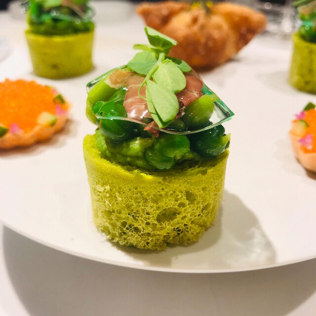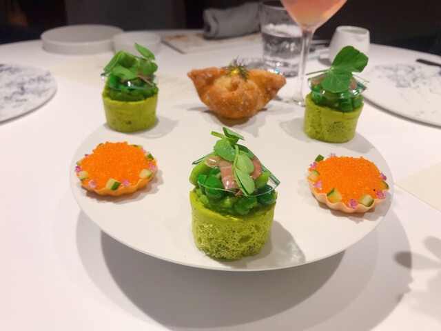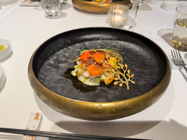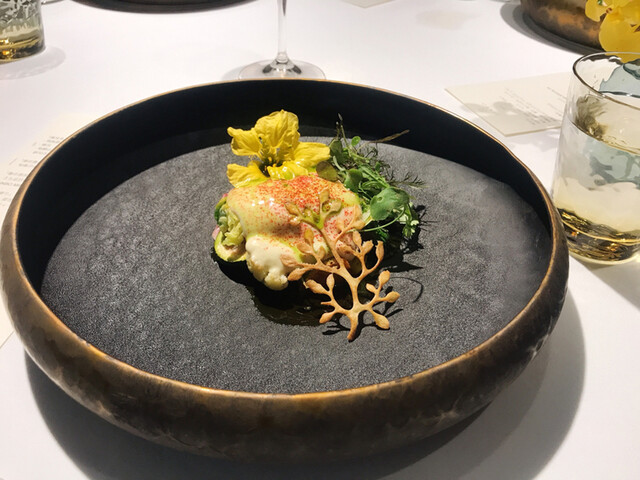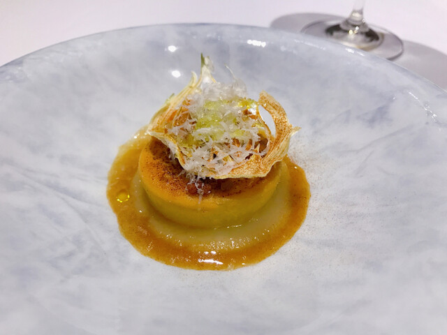 今回の珠玉のお料理の中で特段印象的だったのは、藤田鮪、甘海老、キャビア、根セロリ、林檎、山わさびのタルタル、虎河豚白子と白トリュフのリゾット、そして、外観も斬新で美しい陸奥牛フィレ肉、フォアグラ、金柑、ラディッキオ&黒キャベツのお料理。